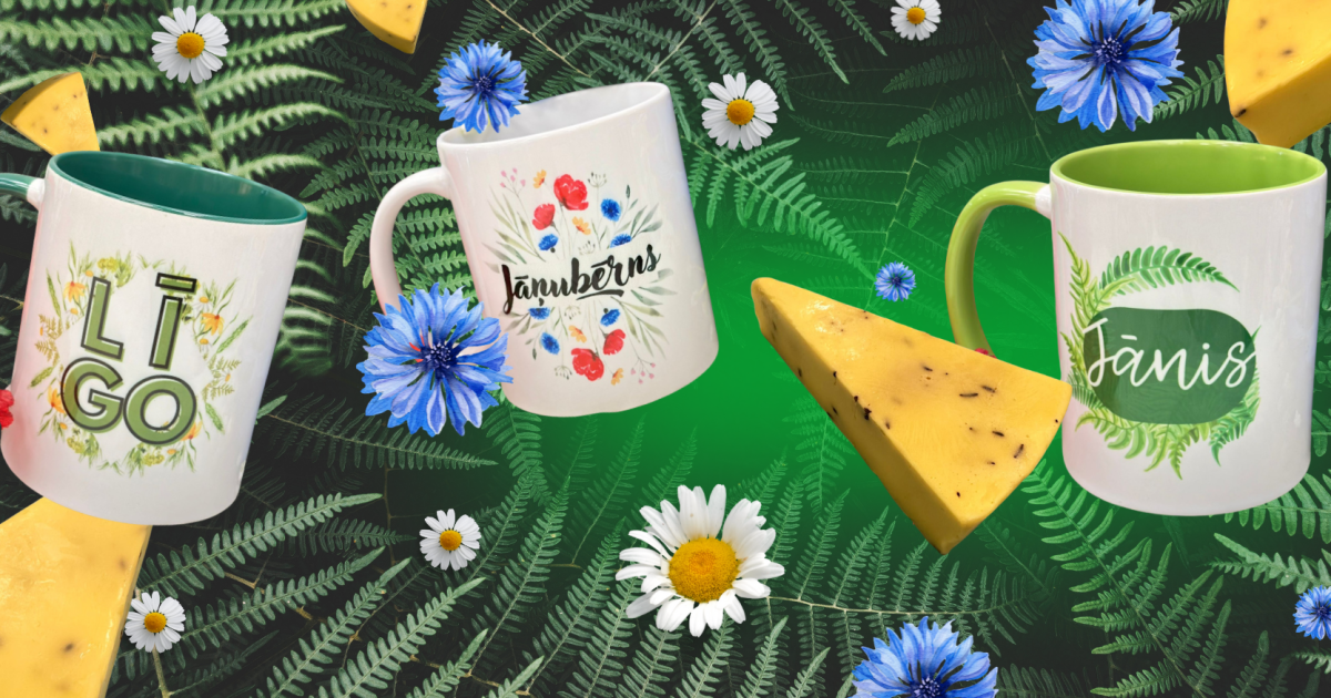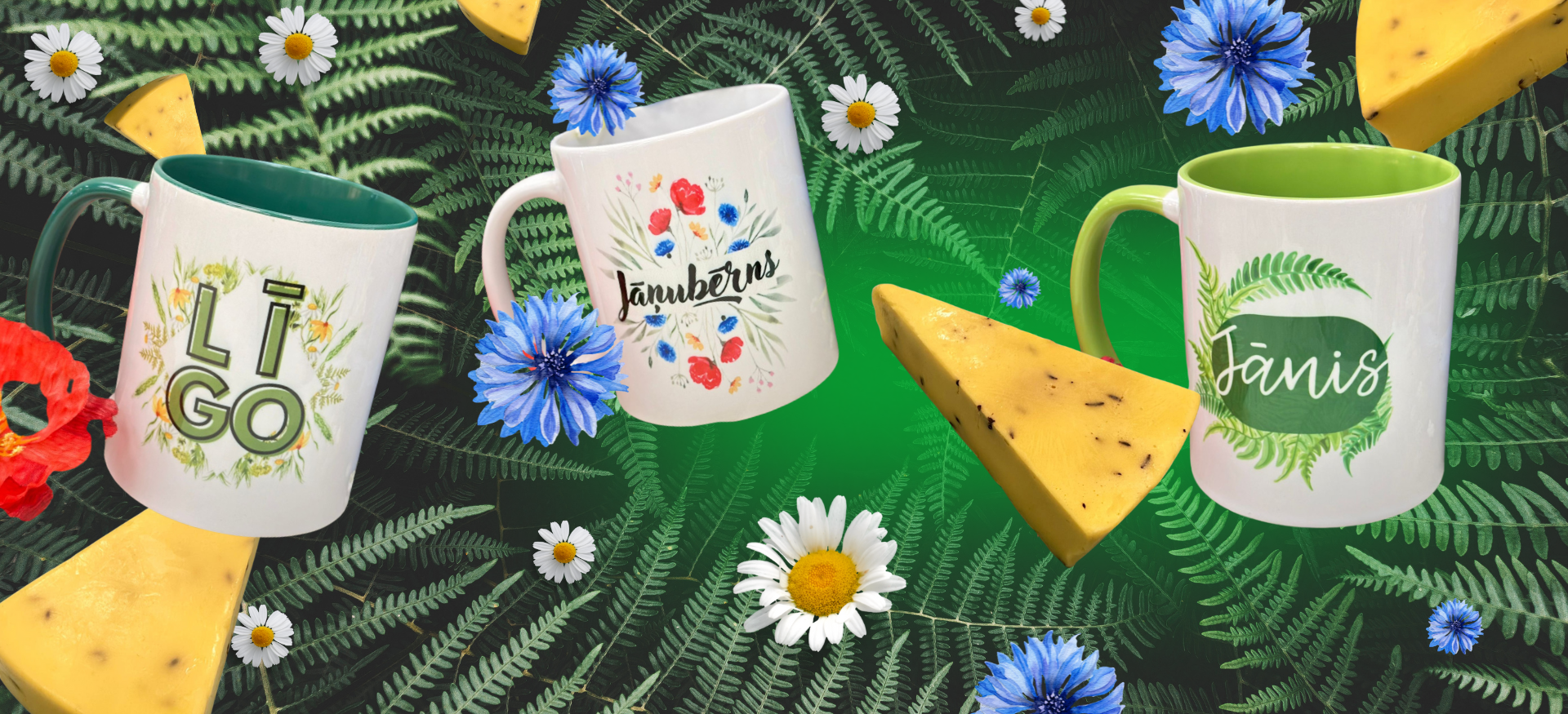 - Tematiskas krūzes ar Līgo simboliem un vasarīgiem uzrakstiem – ideāli rīta kafijai pirms svētku svinībām vai kā mīļa dāvana saimniecei.