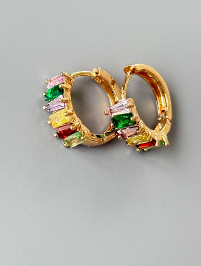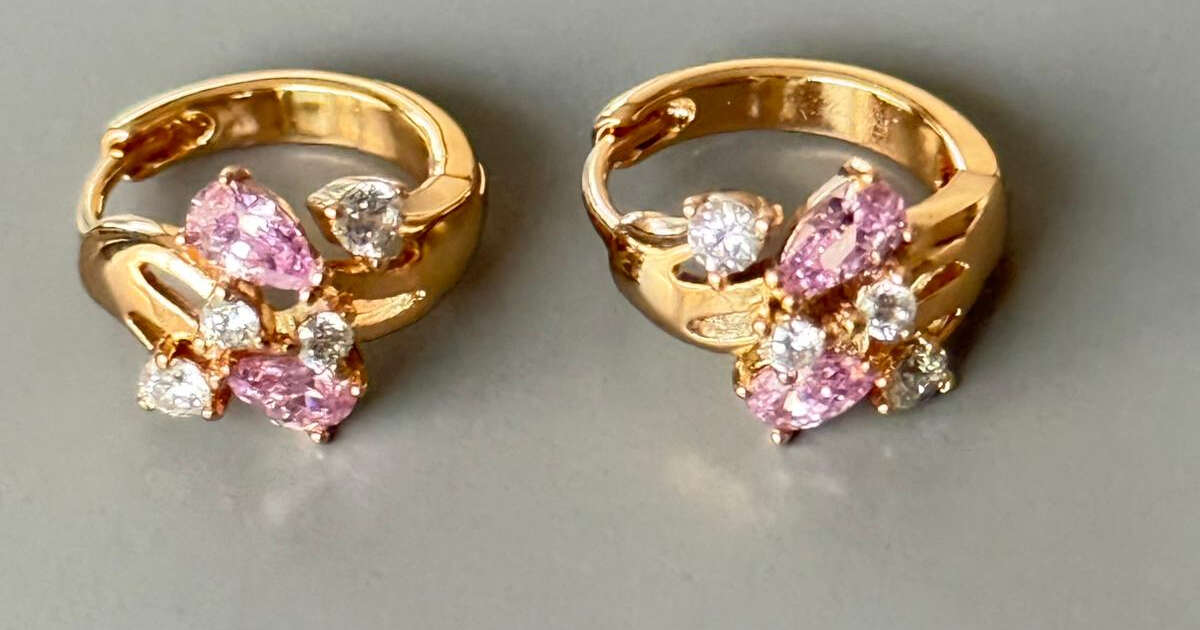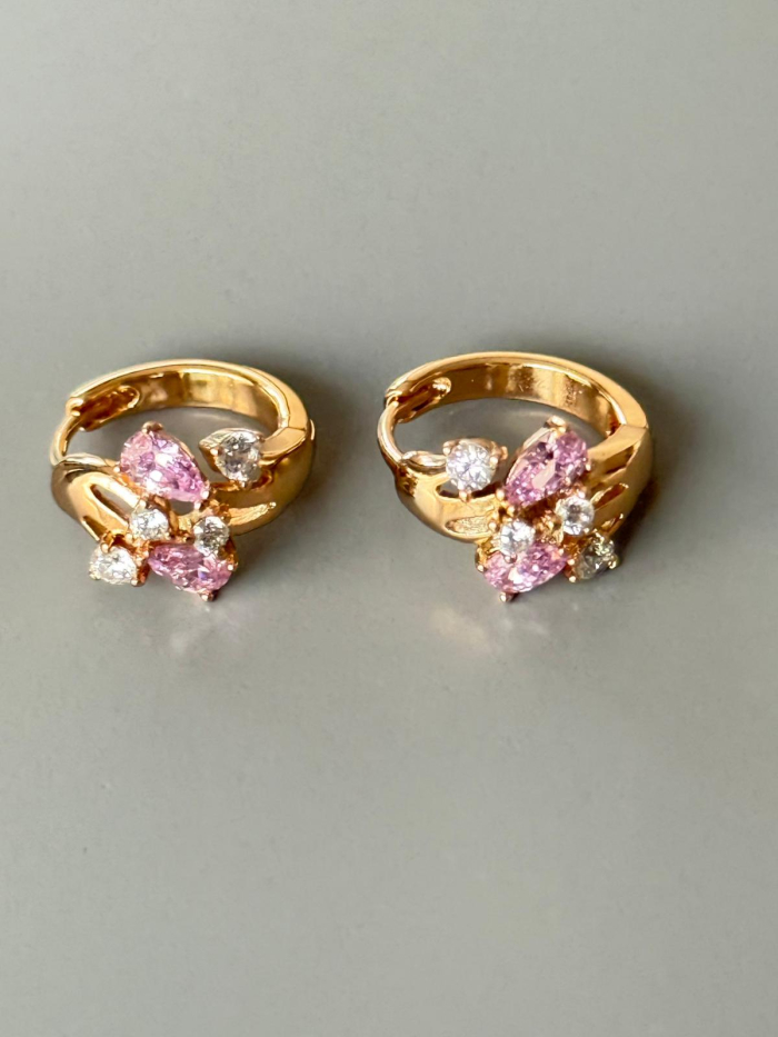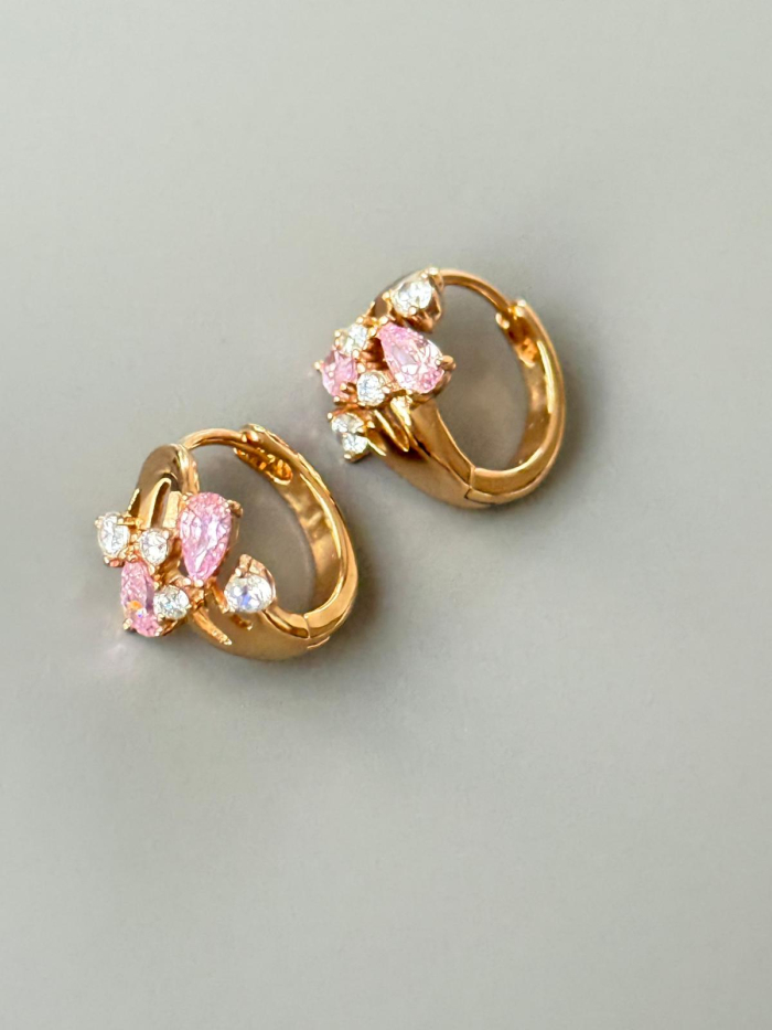 Sieviešķīgi un izsmalcināti apzeltīti auskari ar dzidriem rozā un caurspīdīgiem kristāliem ziedlapiņu formā. Maigais rozā tonis simbolizē romantiku un sievišķīgu šarmu, piešķirot tēlam siltumu un mirdzumu.