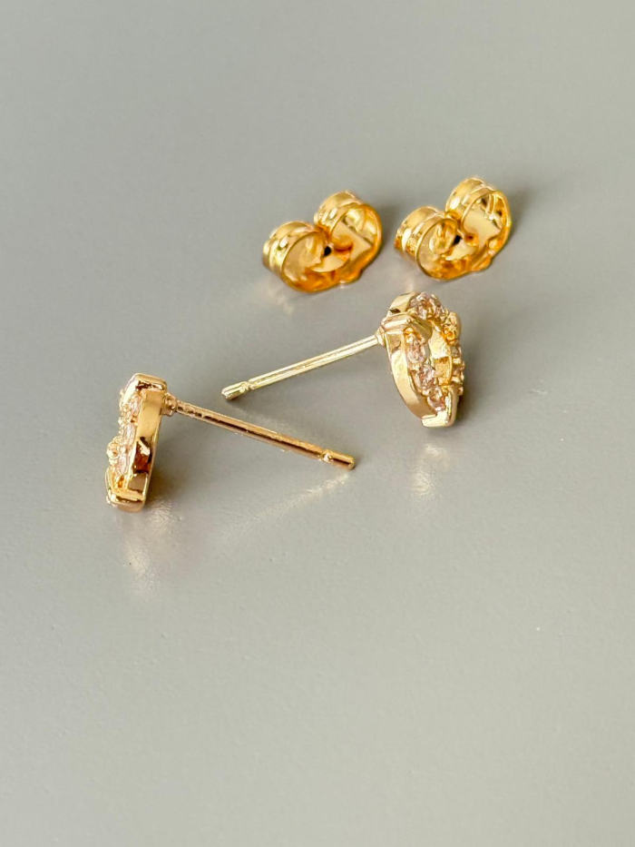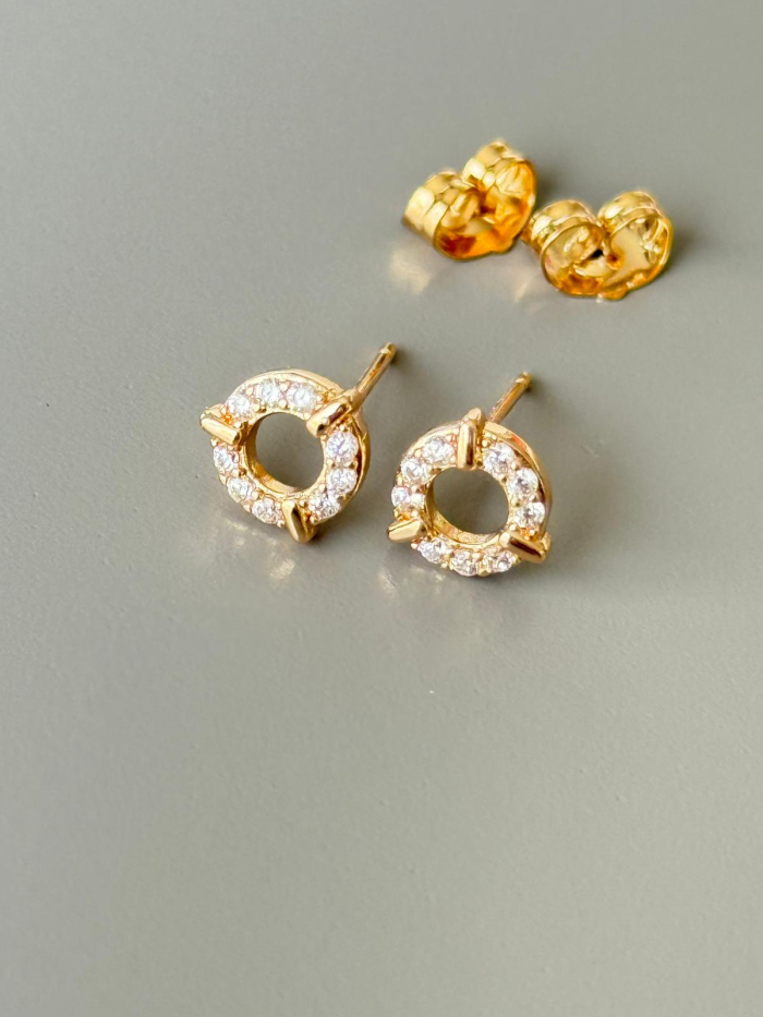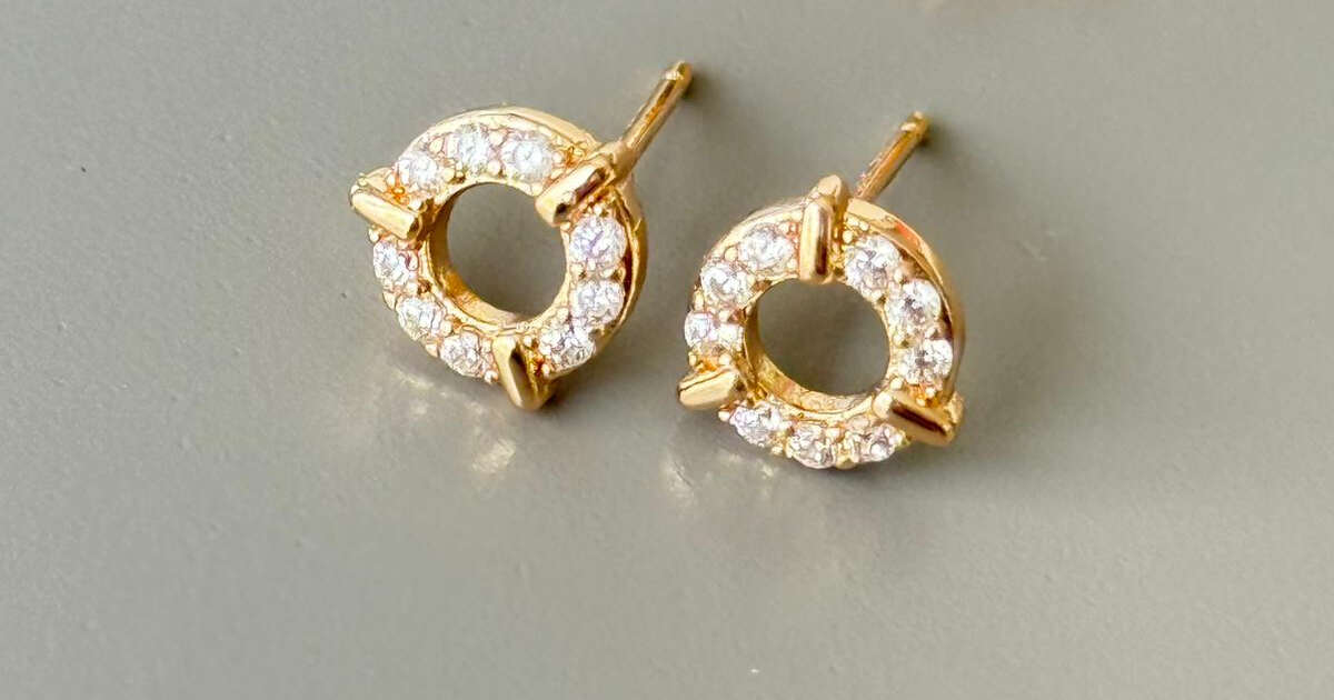 Izsmalcināti nagliņas tipa auskari riņķīša formā ar 8 mm diametru. Zeltījuma pārklājums piešķir siltu toni, bet smalki iemontētie dzidrie kristāli rada īpašu mirdzumu. Šie auskari ir elegants akcents, kas lieliski papildinās gan ikdienas stilu, gan svētku tēlu.