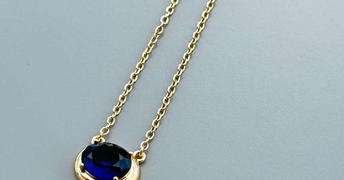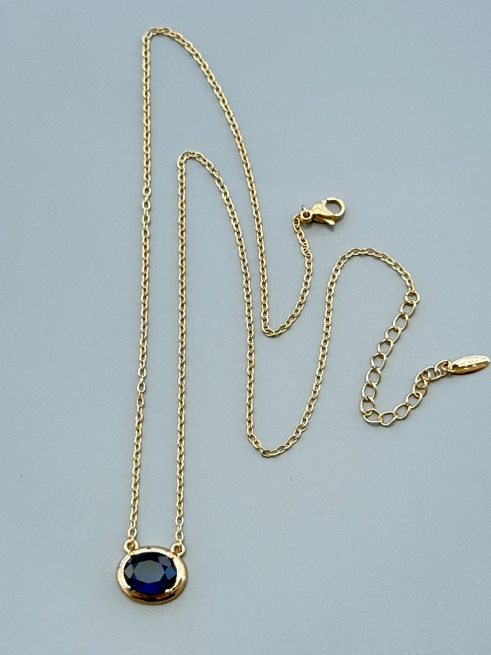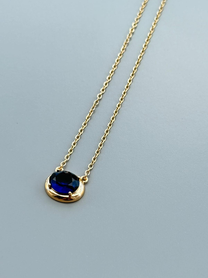 Eleganta ķēdīte ar ovālas formas kulonu, kas rotāts ar tumši zilu kristālu zelta toņa ietvarā. Dziļā kristāla krāsa piešķir izsmalcinātu akcentu, padarot šo rotu par lielisku izvēli gan ikdienai, gan īpašiem notikumiem.