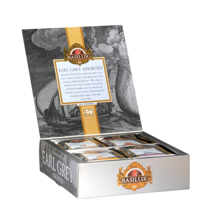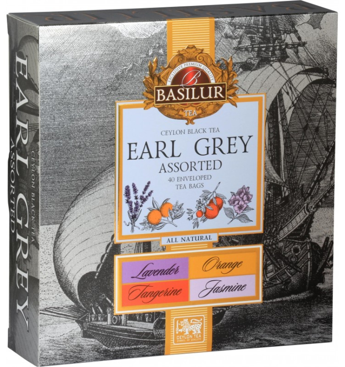 Ceilonas melnā tēja ar dabīgiem lavandas un bergamotes aromatizētājiem, ar dabīgiem mandarīna un bergamotes aromatizētājiem, ar dabīgiem jasmīna un bergamotes aromatizētājiem, ar dabīgiem apelsīna un bergamotes aromatizētājiem.
