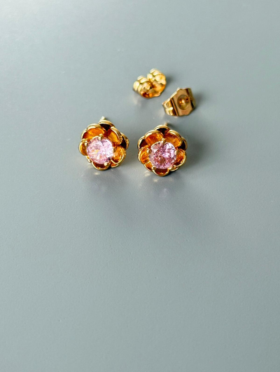 Apzeltīti auskari ar rozā kristālu – zieda forma