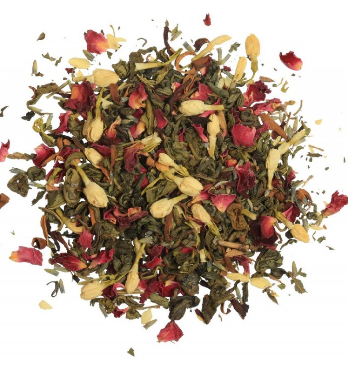 Berama Ceilonas zaļo lapu tēja (yh un chunmee) ar piparmētrām, lavandas, hibiska, jasmīna, apelsīnu koka un rožu ziediem.