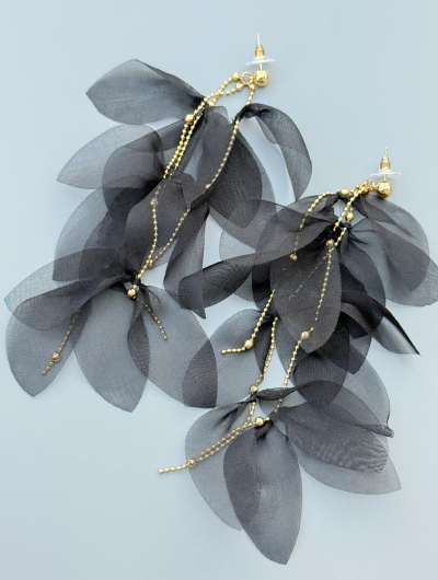 Garie melnie auskari ar ziedlapiņām un ķēdītēm