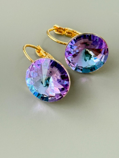 Antialerģiski auskari ar daudzkrāsainu apaļu kristālu violeti zilā tonī
