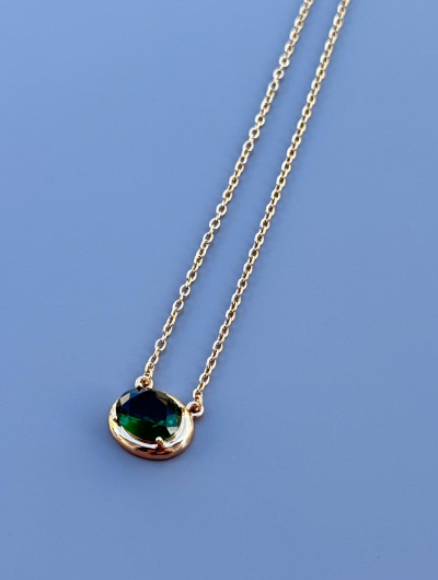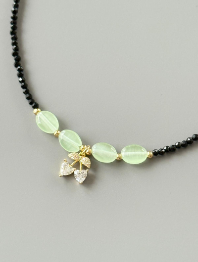 Kaklarota ar melno špineli, maigi zaļām pērlēm un apzeltītu ķiršu kulonu