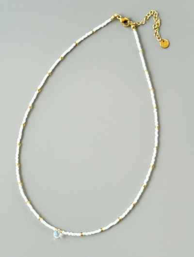 Balta pērlīšu kaklarota ar apzeltītiem akcentiem un kristāla kulonu