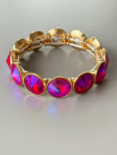 Zelta krāsas rokassprādze ar spilgti fuksijas–violetiem fasetēta stikla akmeņiem
