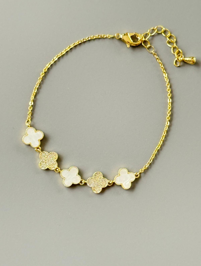 Apzeltīta aproce “CLOVER” ar perlamutra un kristālu āboliņiem
