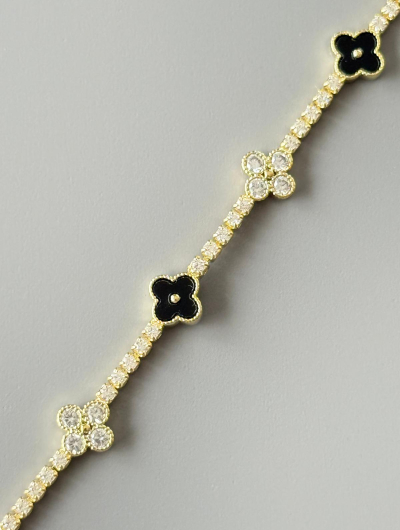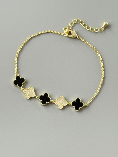Apzeltīta aproce “CLOVER” ar melniem āboliņiem un kristāliem